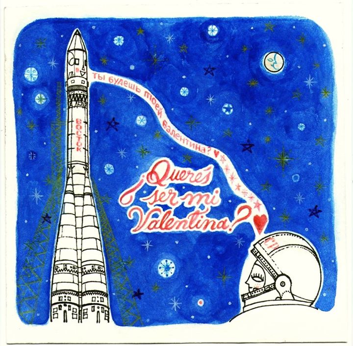 Obvio que iba a hacerle una valentina, pero no podía hacerla menos nerd. Sólo espero no haber dibujado tan mal al Vostok 6 y hubiese preferido que los detalles en amarillo se vieran mejor, pero a T. le gustó y eso bastó.